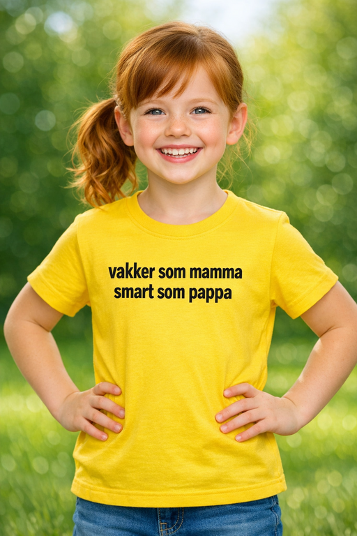 Genene har levert, og ungen tar æren med stil. Denne morsomme barne-T-skjorten med teksten «vakker som mamma, smart som pappa» gir garantert smil – perfekt til små stjerner og foreldre med glimt i øyet.