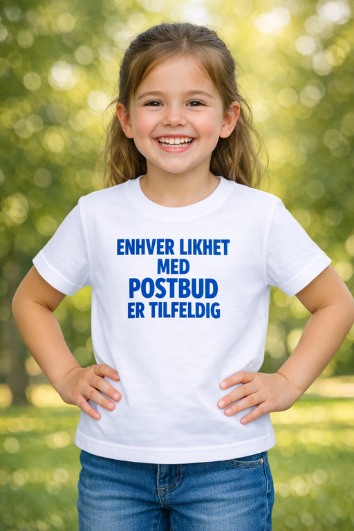 En hvit barneskjorte med en klassisk “alt er helt tilfeldig”-vri som får både voksne og barn til å trekke på smilebåndet – perfekt til barnehage, lekeplass og familiebesøk.