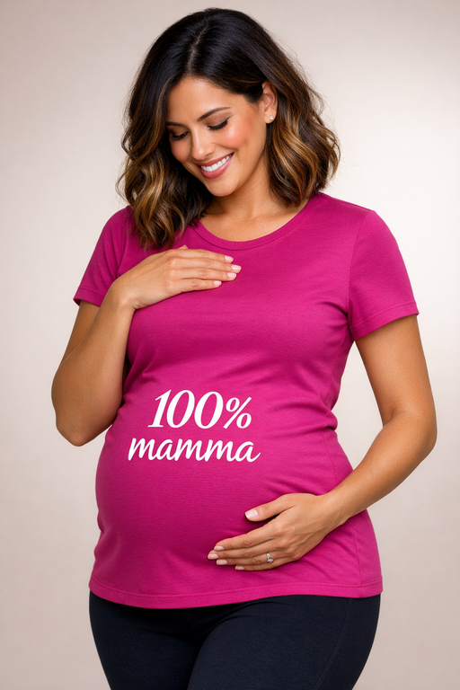 Myk, rosa og full av selvtillit – med teksten 100% mamma får du en morsom og stolt look som lar magen ta hovedrollen.