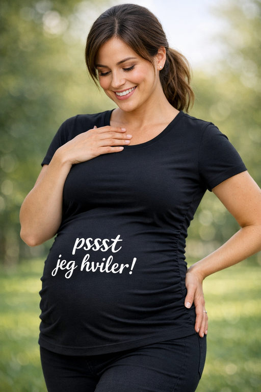 Pssst! Denne svarte gravid-t-skjorten med «pssst jeg hviler!» er den perfekte, vennlige beskjeden når du bare vil ha ro (og gjerne en liten snack).