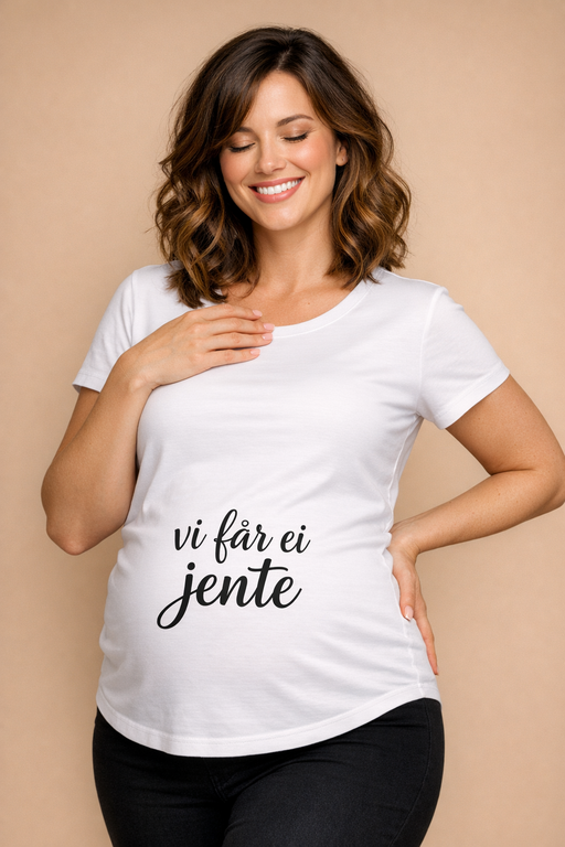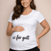 En ren, hvit gravid-t-skjorte med tydelig svart tekst som gjør den store nyheten umulig å overse – søt, selvsikker og akkurat passe stolt.