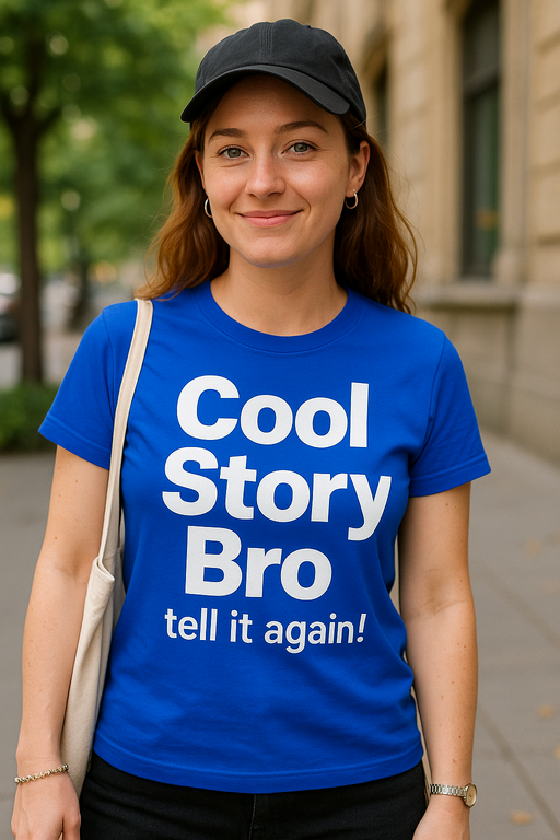 😎 Dagens historie? Si den med T-skjorten: Cool Story Bro tell it again! Denne blå T-skjorten med hvitt trykk er din passiv-aggressive mikrofon når praten drar ut i evigheter.