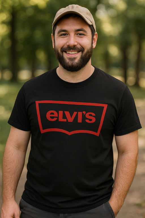 🎸 Kongen lever – det står eLVI’S på den svarte T-skjorten! Denne svarte T-skjorten med rød eLVI’S-tekst er for alle som liker å rocke litt, selv i kaffekøen. Den oser nostalgi, leverer punchline og tiltrekker blikk. Tøff nok for bilder og enkel nok til hverdags.