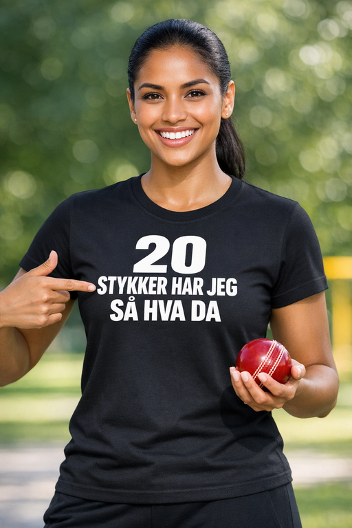 20 HAR JEG, SÅ HVA DA er den perfekte mixen av selvtillit og humor. Den svarte t-skjorten med tydelig hvit tekst funker like bra på vors som på bursdagsbilder – og får folk til å smile.