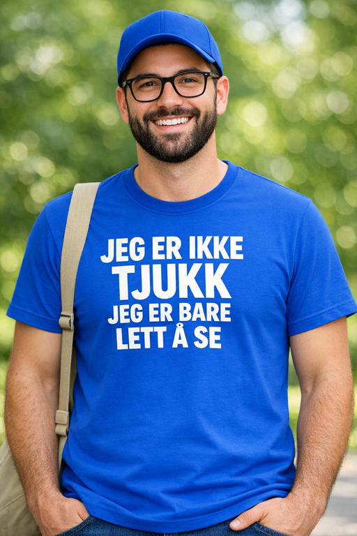 Kongeblå, comfy og umulig å overse – akkurat som budskapet. Den tydelige, hvite teksten JEG ER IKKE TJUKK JEG ER BARE LETT Å SE leverer selvironi med stil og funker like bra på byen som på sofaen.