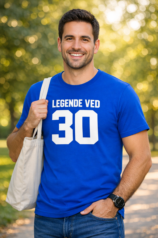 30 år, null stress – denne blå t-skjorten med korte ermer og teksten LEGENDE VED 30 gir deg legendestatus på sekunder og funker like bra på fest som på bursdagsbilder.
