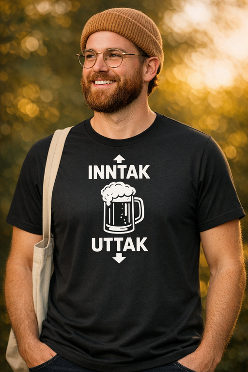 Øl inn, latter ut – det ikoniske «INNTAK / UTTTAK»-trykket med piler og ølkrus er en garantert samtalestarter på fest, festival og pub.