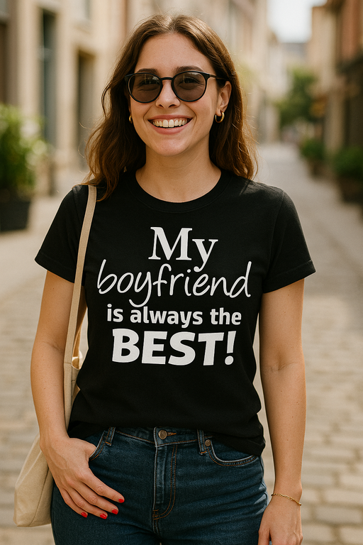 Når kjæresten din er en legende, la verden få vite det! 😎 Svart T-skjorte med teksten ‘My boyfriend is always the BEST!’. Perfekt for deg som vil skryte av helten din med humor og stil. 💘