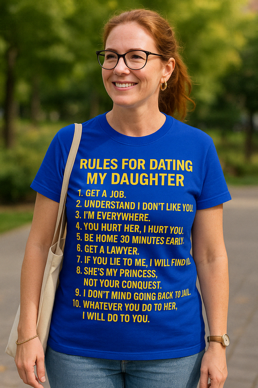 😂 Kjærligheten er blind, men denne T-skjorten har ørneblikk: RULES FOR DATING MY DAUGHTER! Den blå T-skjorten med dristig gult trykk sørger for at frierne forstår reglene før de i det hele tatt ringer på.