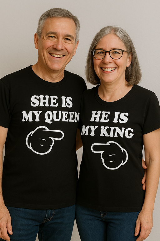 👑 Når dere er et kongelig duo, bør verden få vite det: SHE IS MY QUEEN / HE IS MY KING! To svarte T-skjorter med kort erm og en morsom pekefinger-grafikk sier alt – før noen rekker å spørre «hvem hører sammen?». Perfekt for par som liker å tulle, styrer sitt eget rike og samler komplimenter på gata.
