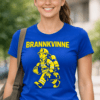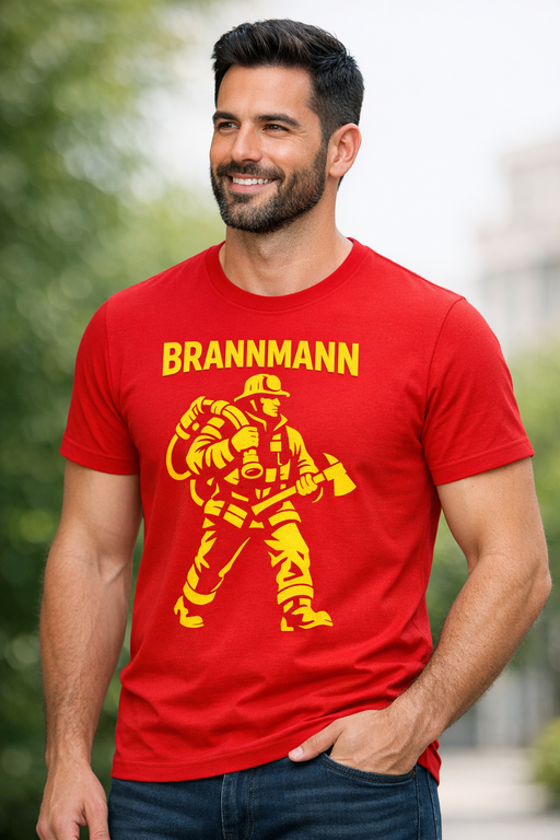 Knallrød t-skjorte med en gul brannmann i fullt utstyr og teksten BRANNMANN – et klart statement for deg som står på når det gjelder (og liker å se bra ut mens du gjør det).