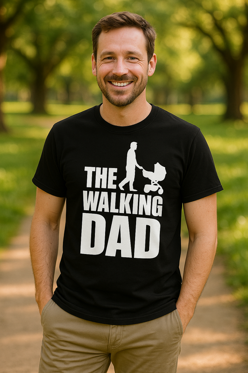 Når du står opp om natta på kall fra den lille sjefen, blir du… THE WALKING DAD. 🧟‍♂️🍼 Svart T-skjorte for trillehelter og pappaer med solid sans for humor. Perfekt gave til nye og kommende fedre! 🎁