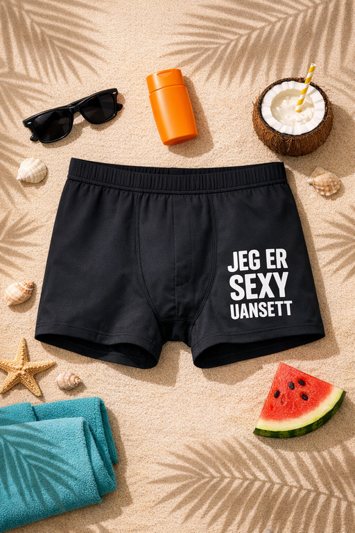 JEG ER SEXY UANSETT – kort, frekt og helt på plass. Svarte boxere med en morsom statement-print som løfter humøret og selvtilliten uten at du trenger å si et ord.